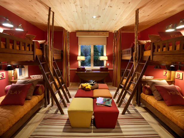 Probably the most charming is the "ski dorm" as they dubbed it. Sleeps 8. The table against the far wall unfolds to a large game table and the ottomans in the center can be used as chairs. Clever. Steal this idea: each pillow had unique embroidery on it: Play, Hike, Ski, Fish, Bike....